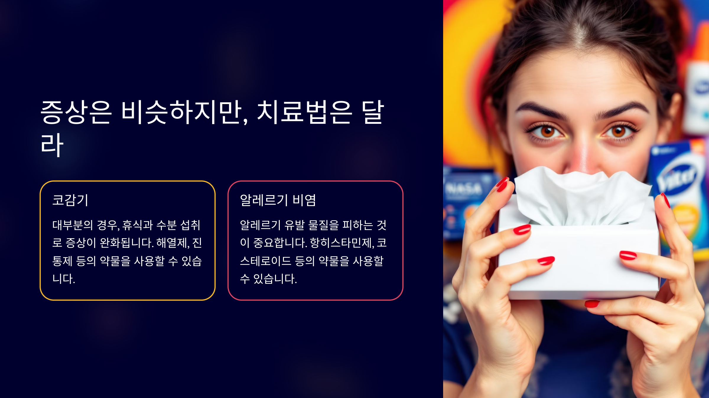 감기와 비염은 증상이 비슷하지만, 치료법은 완전히 달라요. 감기는 바이러스 감염으로 인해 발생하므로 면역력을 높이고 충분한 휴식이 가장 중요해요. 반면, 비염은 면역체계의 과민 반응이므로 원인 물질을 피하는 것이 최선의 치료법이에요. 🌡️