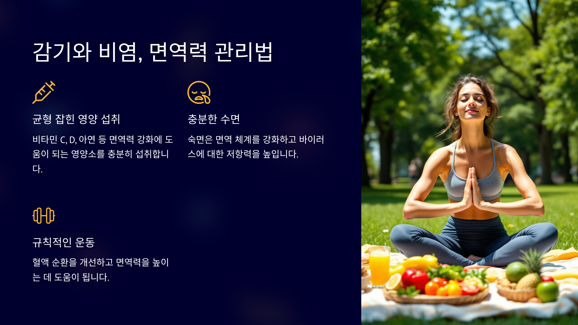 면역력 강화 | 충분한 수면, 균형 잡힌 식사 | 규칙적인 운동, 비타민 섭취 |