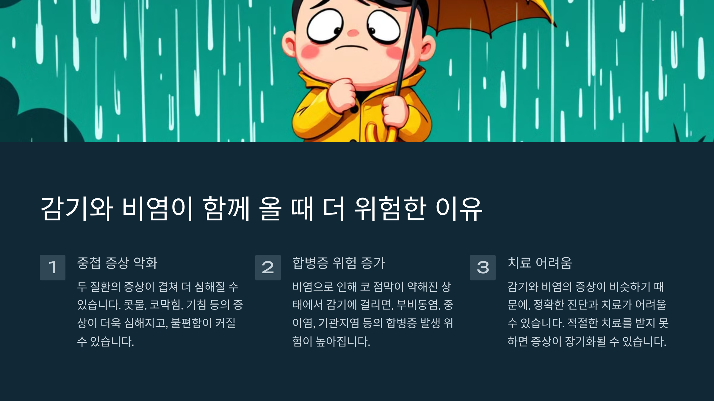 이제 감기와 비염이 동시에 올 경우 어떤 위험이 있는지 살펴볼까요? 👇