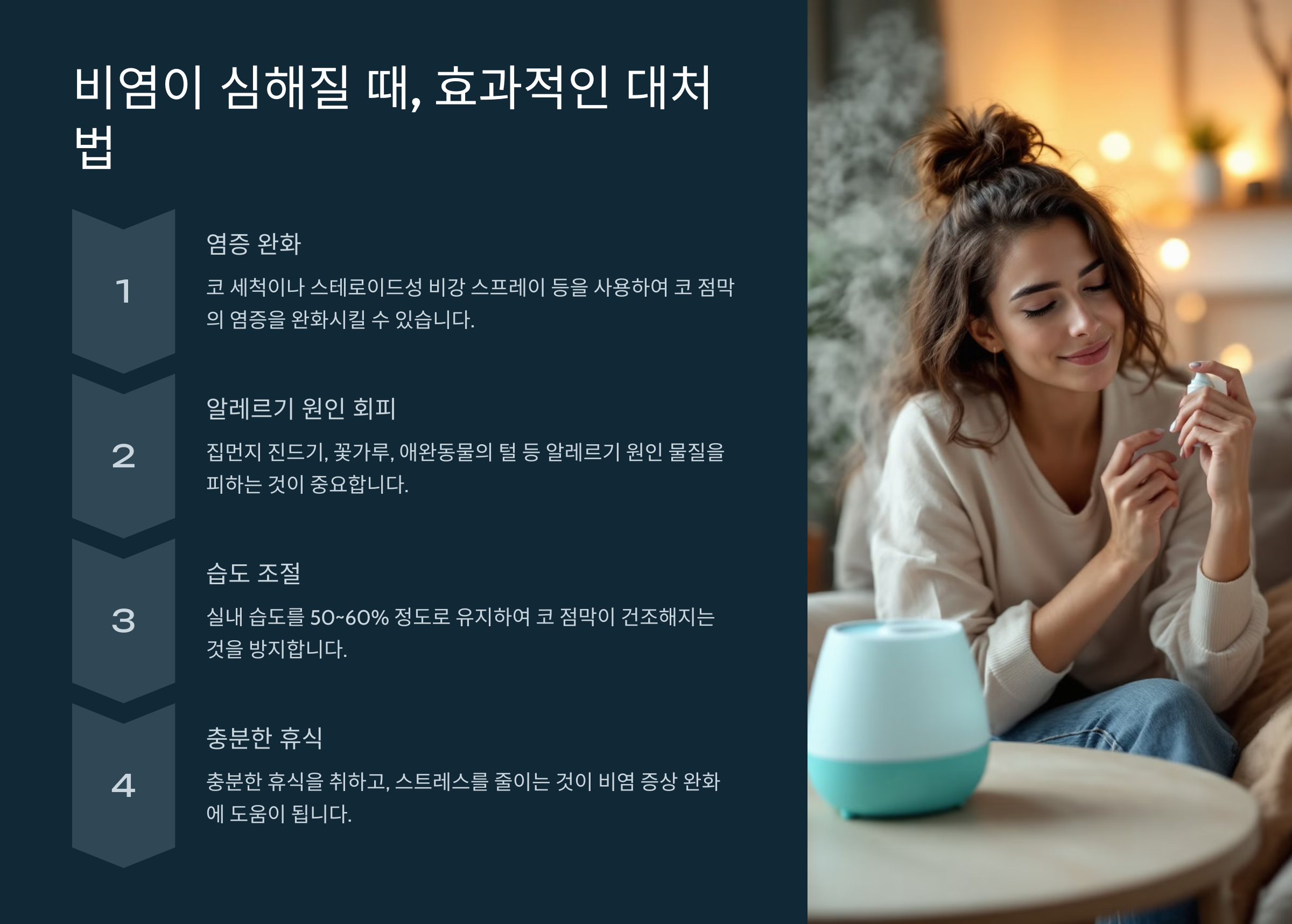 비염이 감기처럼 심해질 때는 원인에 따라 적절한 대처가 필요해요. 만약 먼지, 꽃가루, 반려동물 털 같은 환경적 요인이 원인이라면 실내 청결을 유지하는 것이 중요해요. 반면 건조한 공기 때문에 증상이 심해진다면 가습기를 사용하거나 식염수로 코 세척을 해주는 것이 도움이 돼요.
