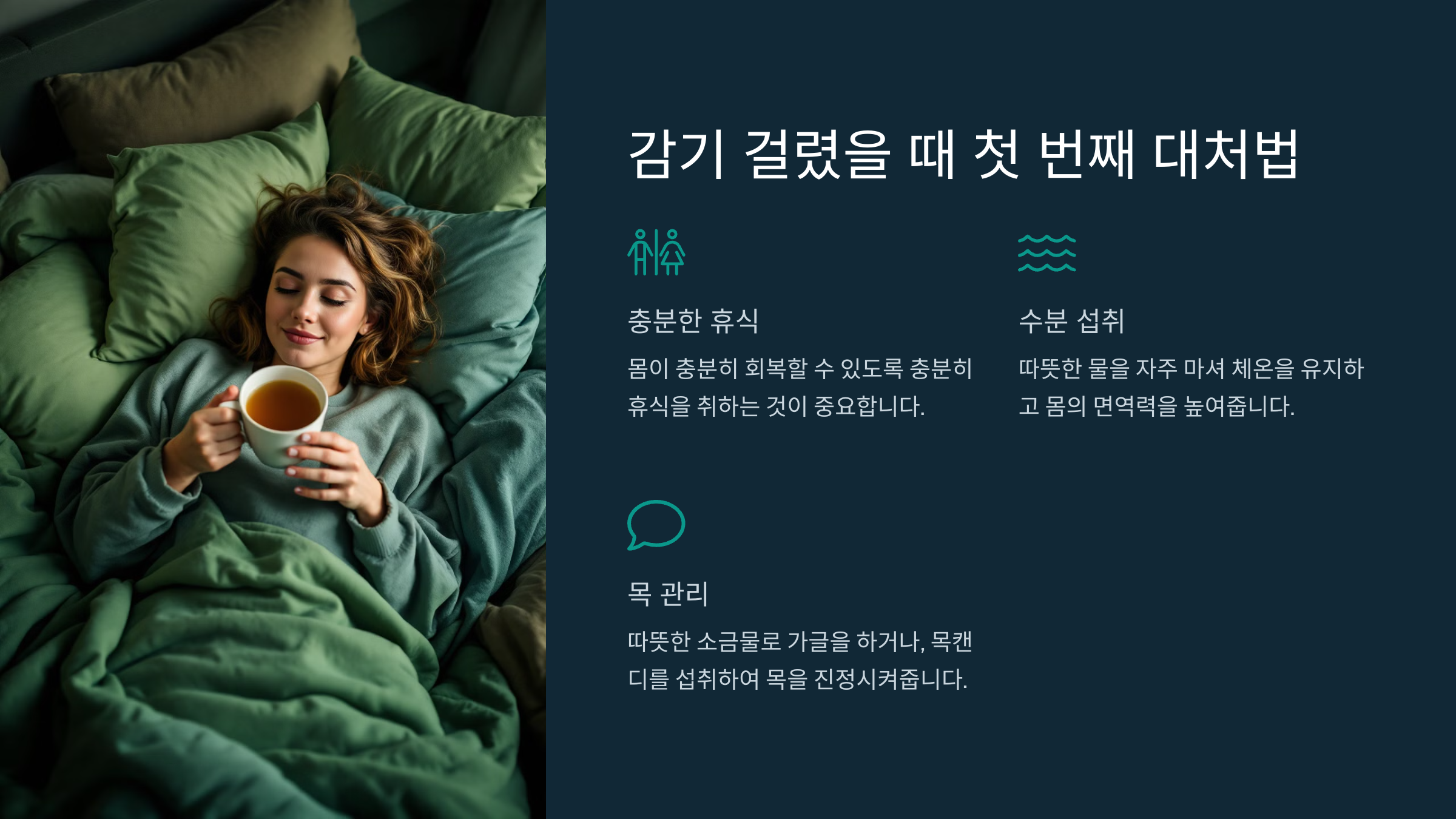 이처럼 감기에 걸렸을 때 빠르게 증상을 완화하는 핵심은 충분한 휴식과 따뜻한 환경 유지예요! 감기 초기에는 몸을 따뜻하게 하고 수분을 충분히 섭취하는 것이 가장 중요하답니다. 😊