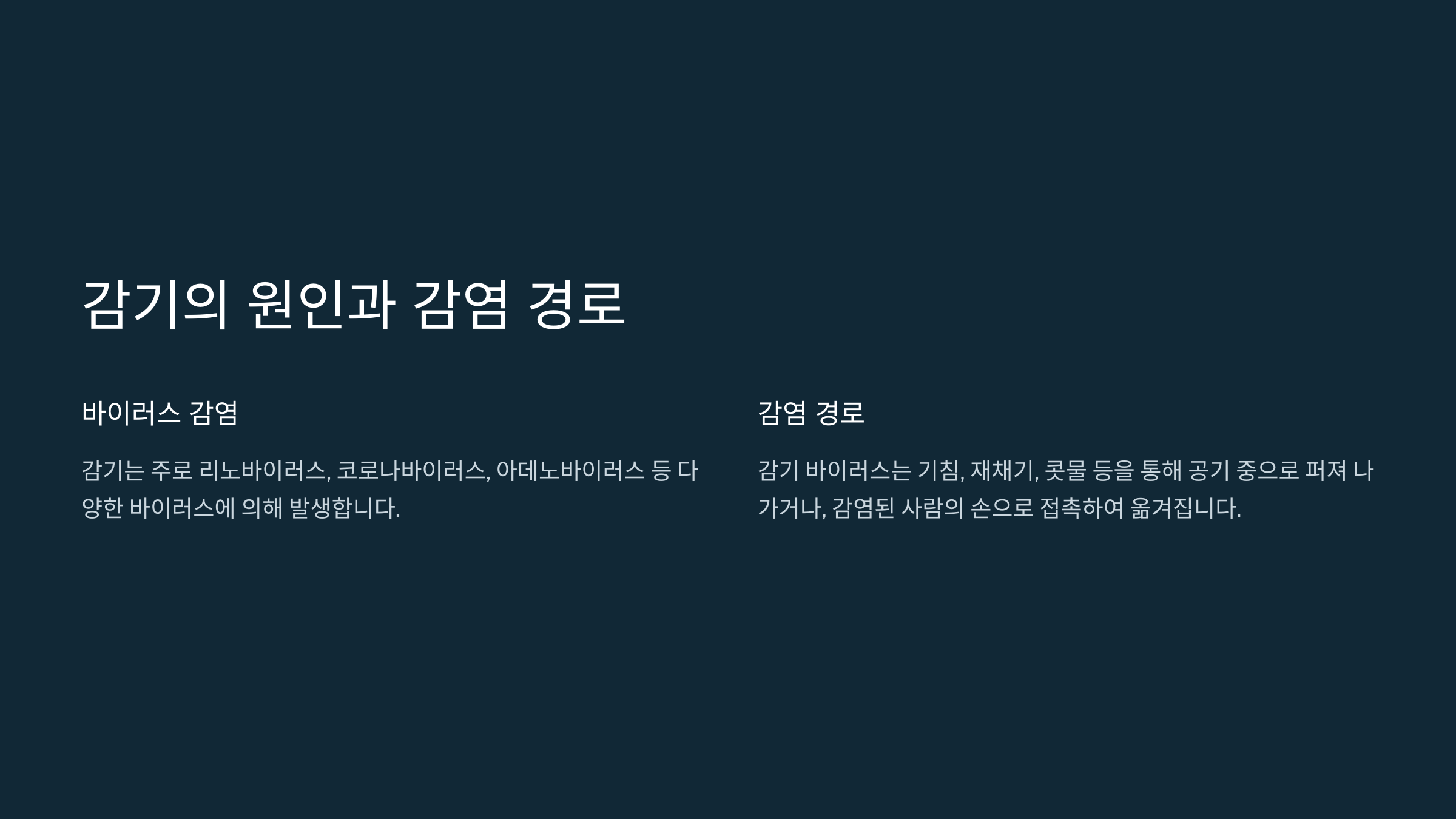 감기는 주로 리노바이러스(Rhinovirus) 등 다양한 바이러스에 의해 발생해요. 환절기와 겨울철에 면역력이 약해지면 감기에 쉽게 걸릴 수 있어요.