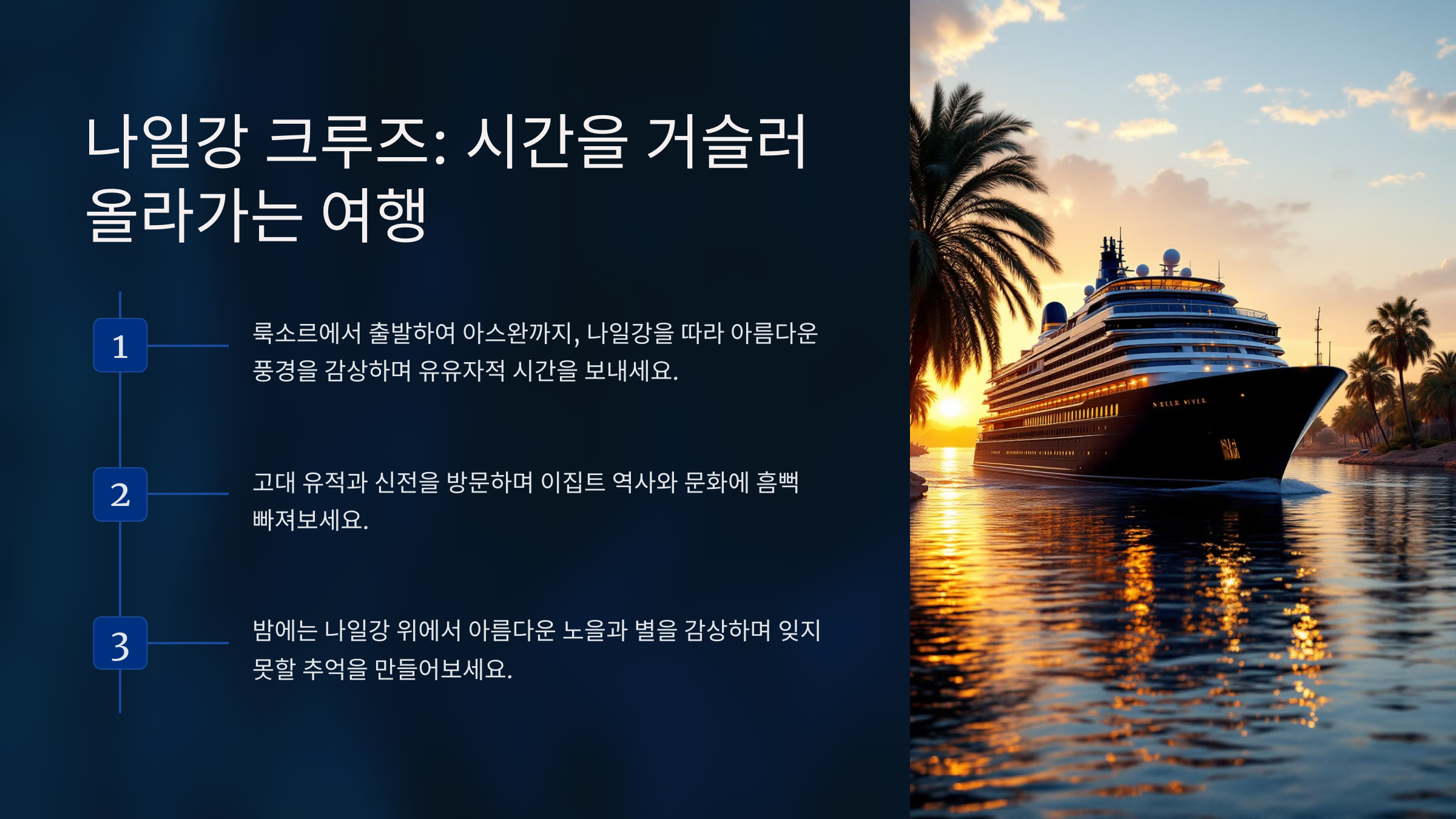 이집트 여행에서 가장 낭만적인 경험 중 하나는 바로 나일강 크루즈예요. 🛳️ 일반적으로 룩소르에서 출발해 아스완까지 이동하는 일정으로 진행되며, 여행하는 동안 고대 유적지를 여유롭게 감상할 수 있어요.