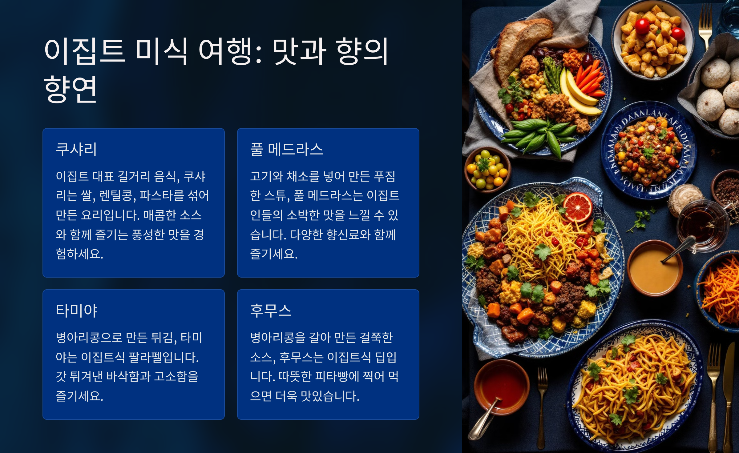 이집트는 다양한 향신료와 고대부터 전해 내려온 독특한 요리법으로 미식가들에게 특별한 경험을 선사하는 나라예요. 특히 나일강 주변에서 발전한 음식 문화는 신선한 재료와 강렬한 맛이 특징이에요. 🌍🍽️