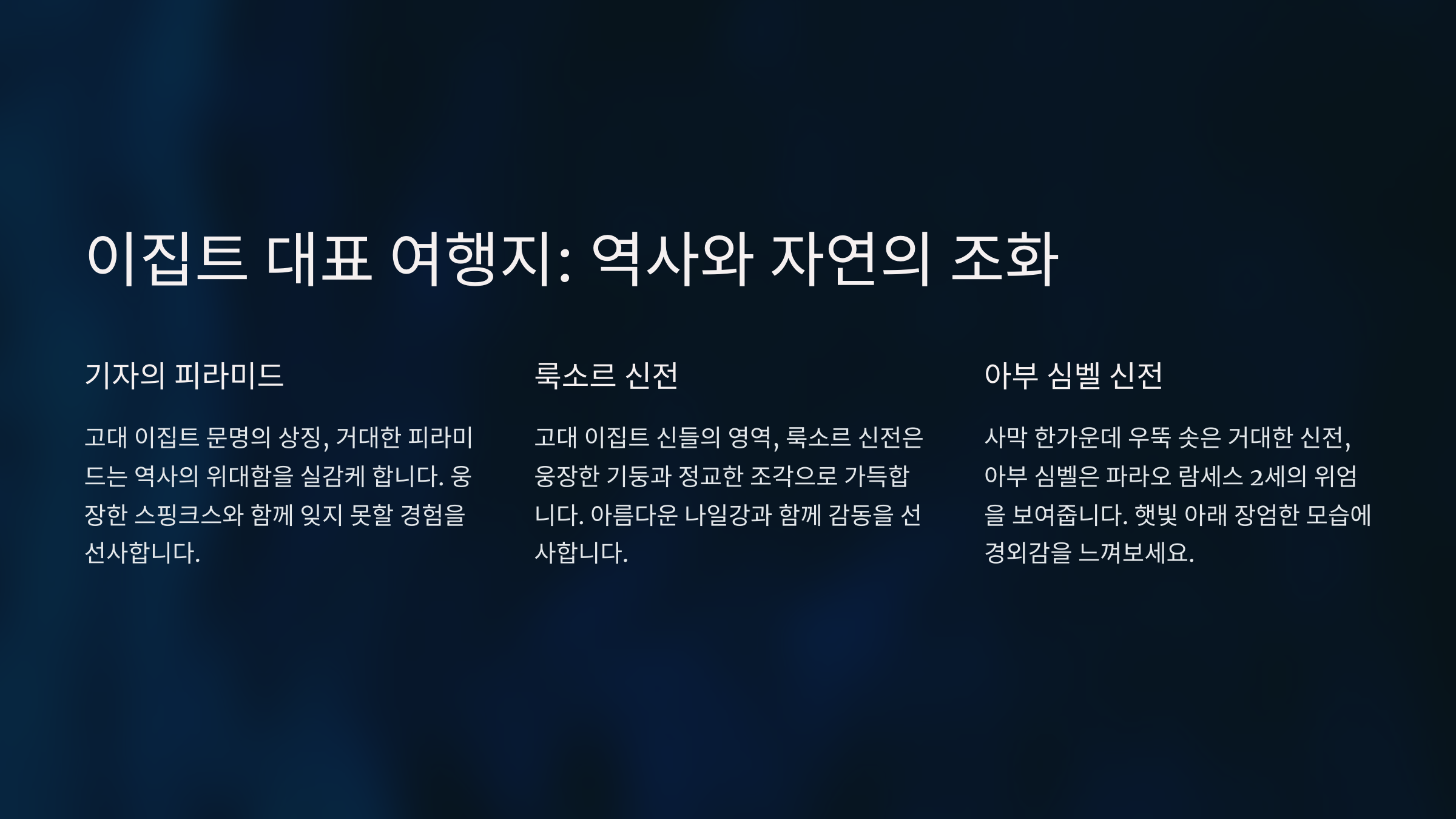이집트는 고대 문명의 발상지이자 신비로운 피라미드와 스핑크스가 자리한 여행자의 꿈의 목적지예요. 🌍