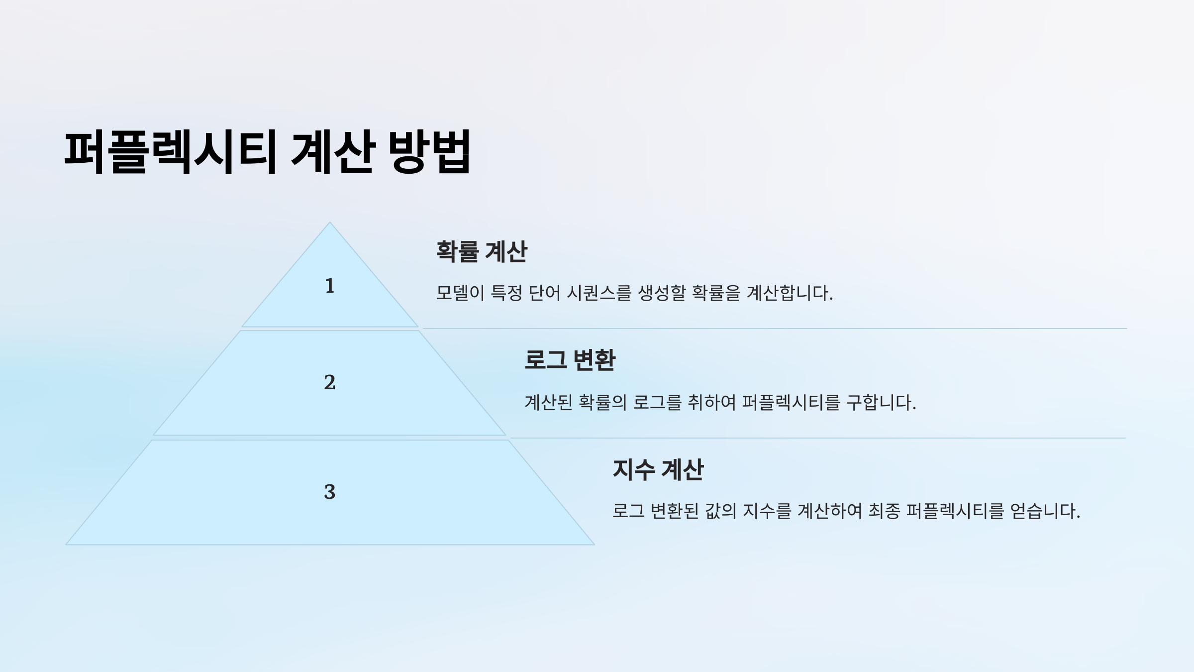 이처럼 퍼플렉시티는 다양한 AI 모델을 평가하는 데 중요한 역할을 해요. 퍼플렉시티 값을 어떻게 계산하는지 더 자세히 알아볼까요?