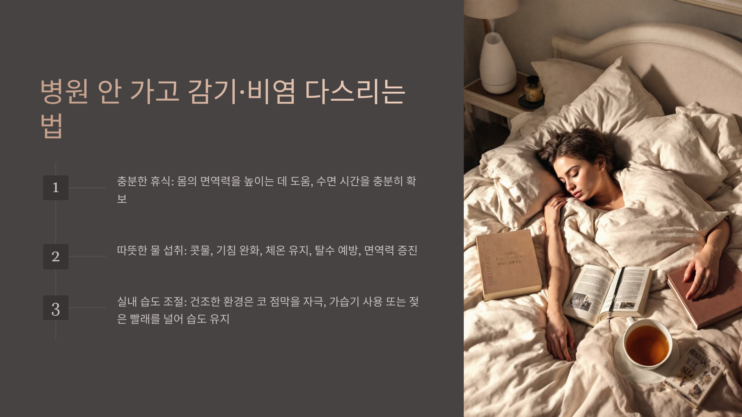 - 수면을 충분히 취해 면역 체계를 강화하세요. (하루 7~9시간 수면 권장)