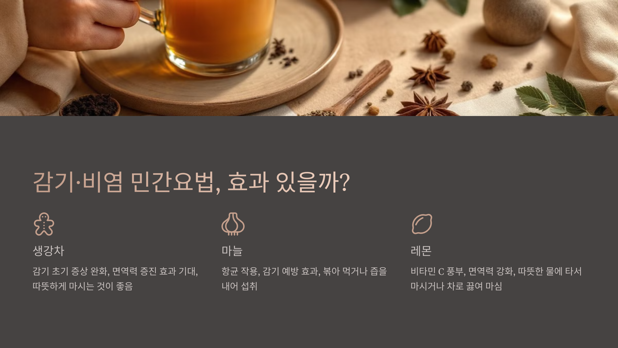 - 생강차, 꿀차 같은 따뜻한 차를 마시면 증상 완화에 도움이 돼요.