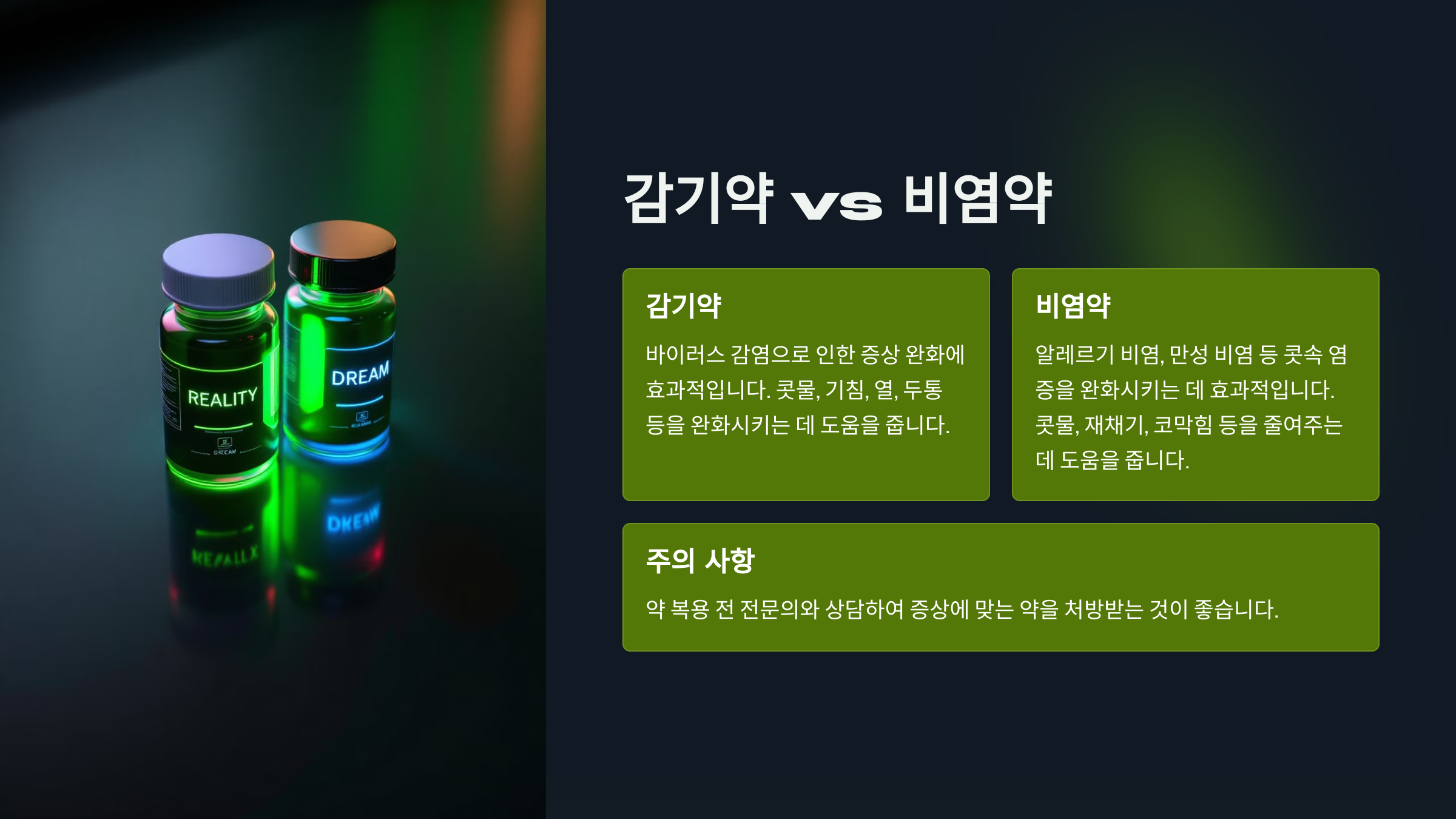 감기인지 비염인지 헷갈려서 아무 약이나 먹으면 증상이 악화될 수 있어요. 감기약과 비염약의 차이를 제대로 알고 올바르게 복용하는 것이 중요해요.