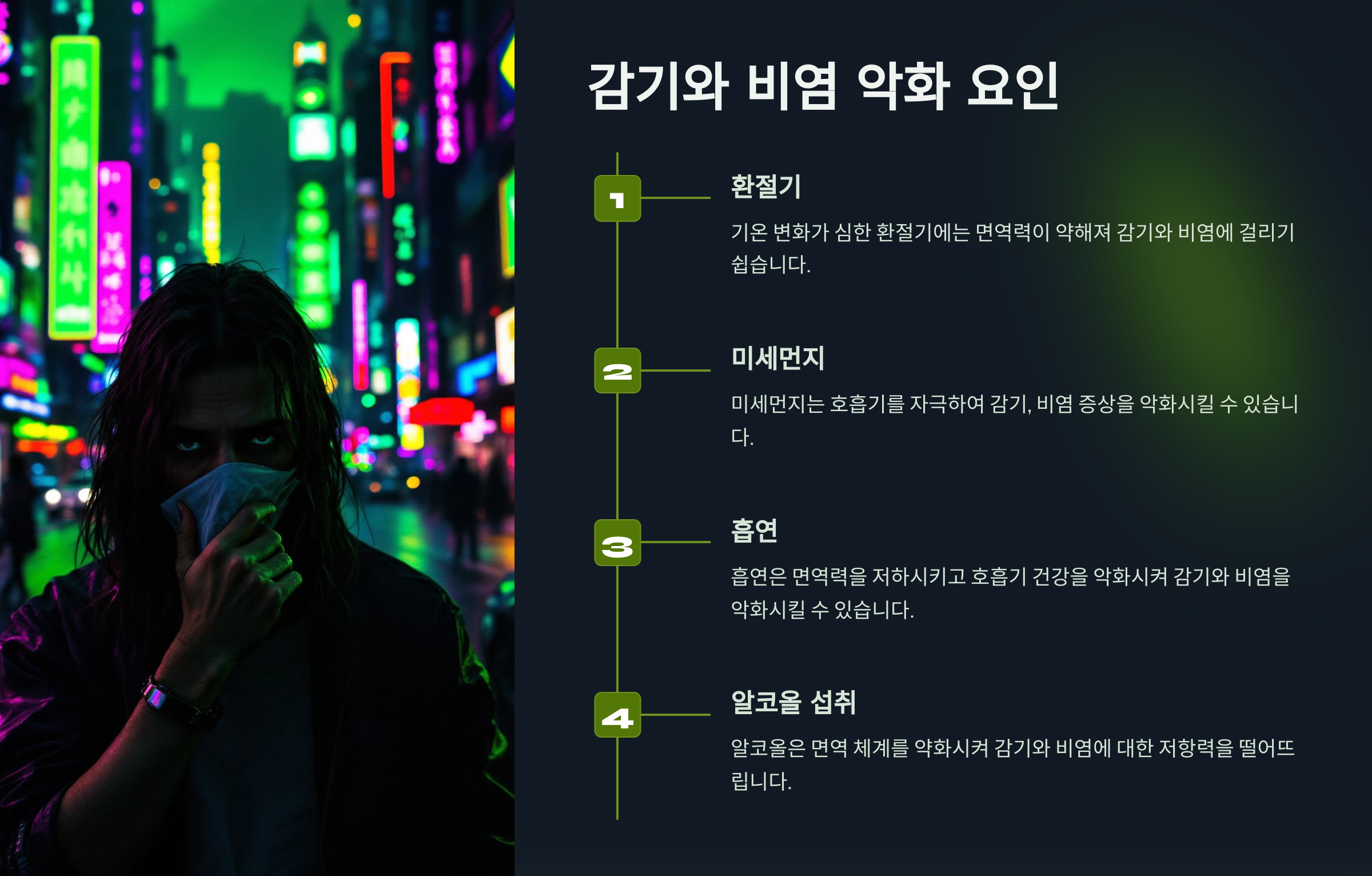 감기와 비염이 심해지는 것을 막으려면 위의 요인들을 피하는 것이 중요해요. 특히 실내 환경을 청결하게 유지하고 면역력을 높이는 것이 가장 효과적인 방법이랍니다! 😊