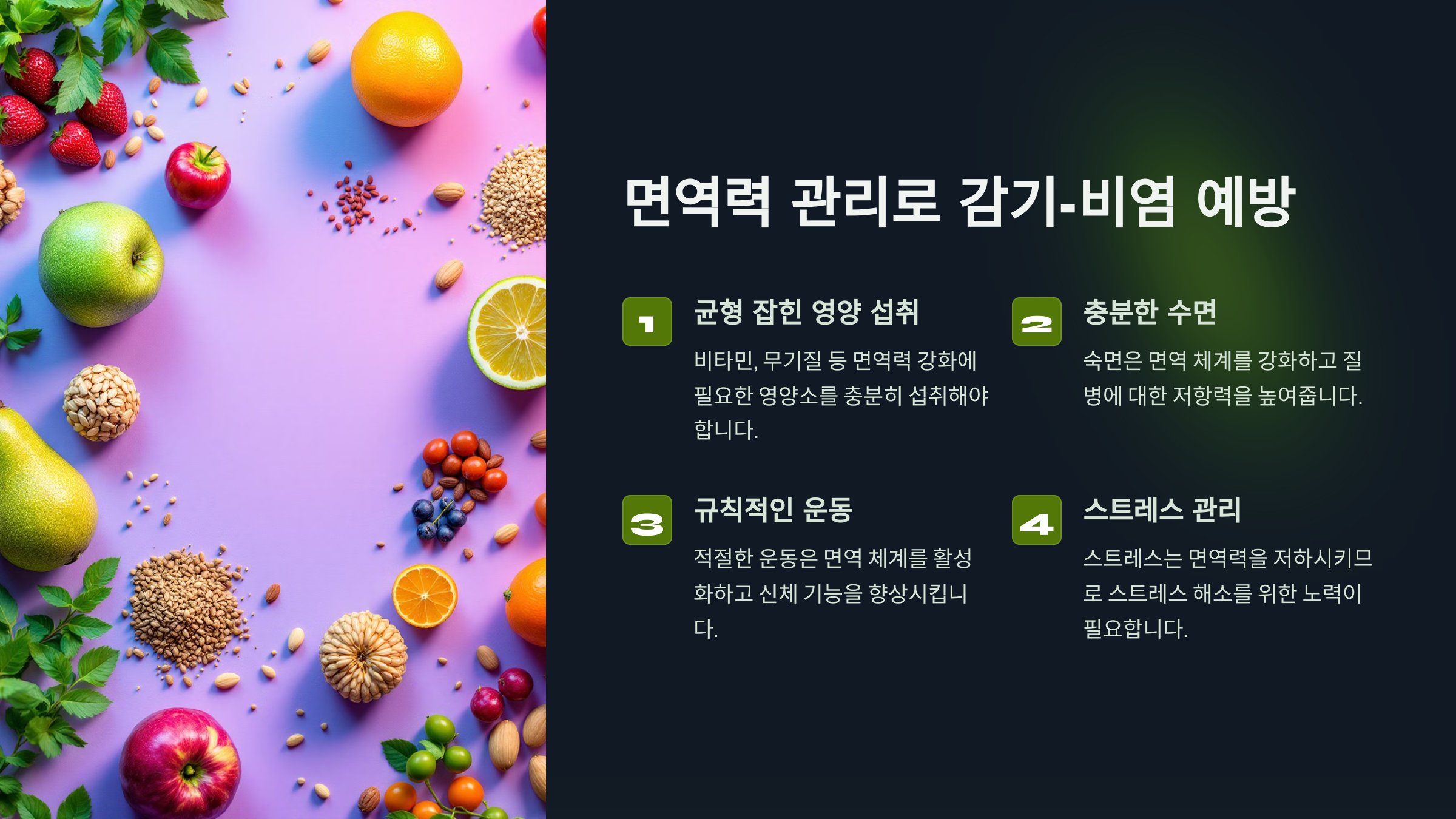 - 면역력 강화 (비타민 C, 숙면, 균형 잡힌 식사)
