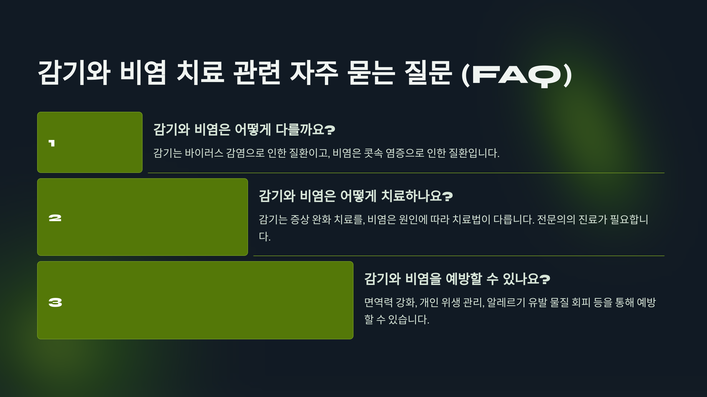 A8. 면역력을 높이는 것이 가장 중요해요! 충분한 수면, 건강한 식습관, 손 씻기, 실내 습도 조절을 통해 감기와 비염을 예방할 수 있어요. 특히 계절 변화에 대비해 건강 관리에 신경 쓰는 것이 좋아요.