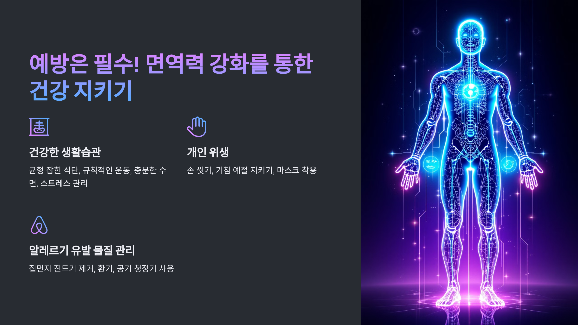 | 면역력 강화 | 충분한 수면, 균형 잡힌 식사 | 비타민 C 섭취, 스트레스 관리 |