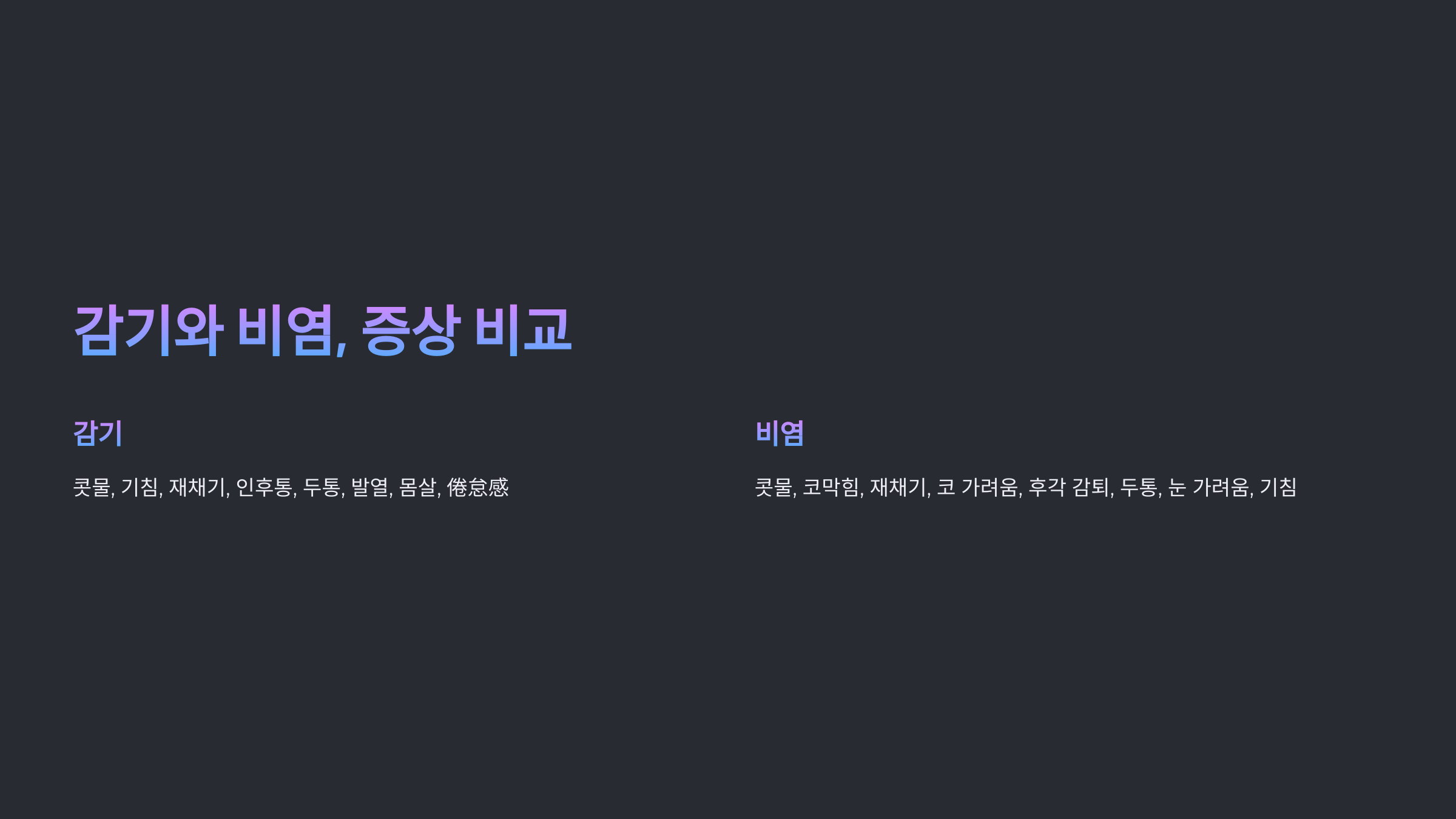 | 예방법 | 감기 예방 🦠 | 비염 예방 🌿 |