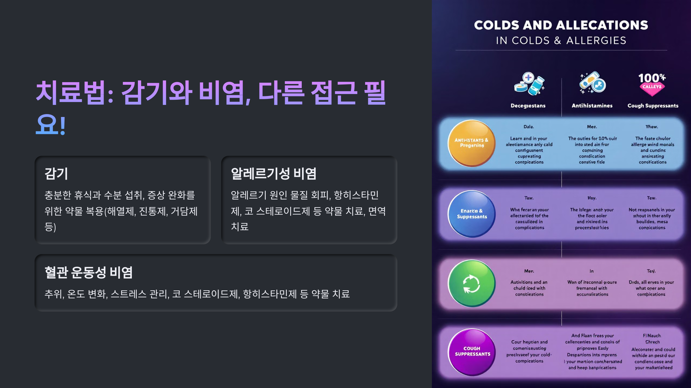 감기와 비염은 원인이 다르기 때문에 치료법도 완전히 달라요. 감기는 바이러스 감염으로 인해 발생하기 때문에 증상을 완화하는 대증치료가 중심이에요. 반면, 비염은 원인 물질을 피하는 것이 가장 중요한 치료법이에요.