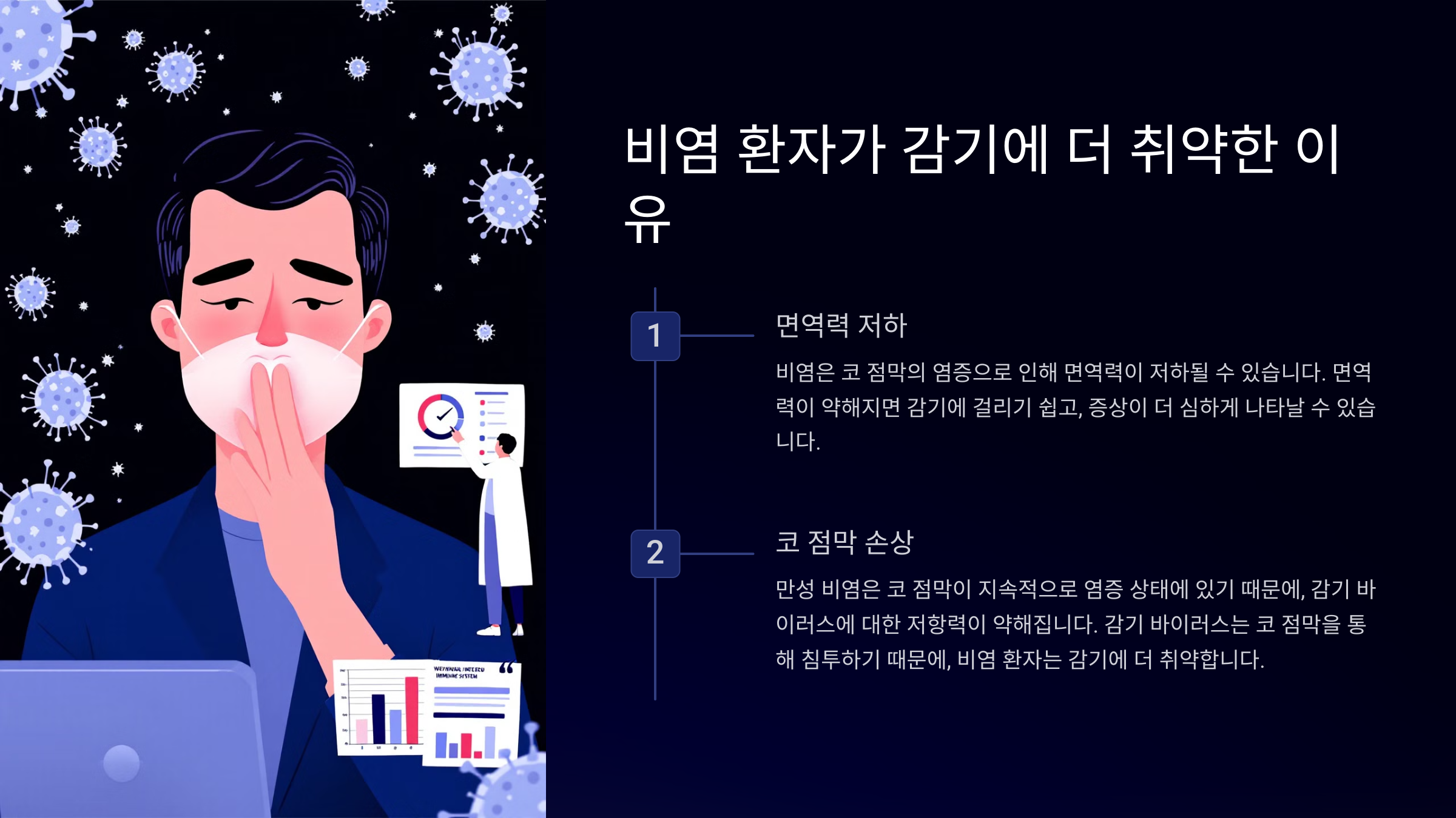 비염이 있는 사람들은 감기에 더 자주 걸리고, 증상도 오래 지속될 가능성이 높아요. 그 이유는 코 점막이 약해져서 바이러스 침투가 쉬워지기 때문이에요.