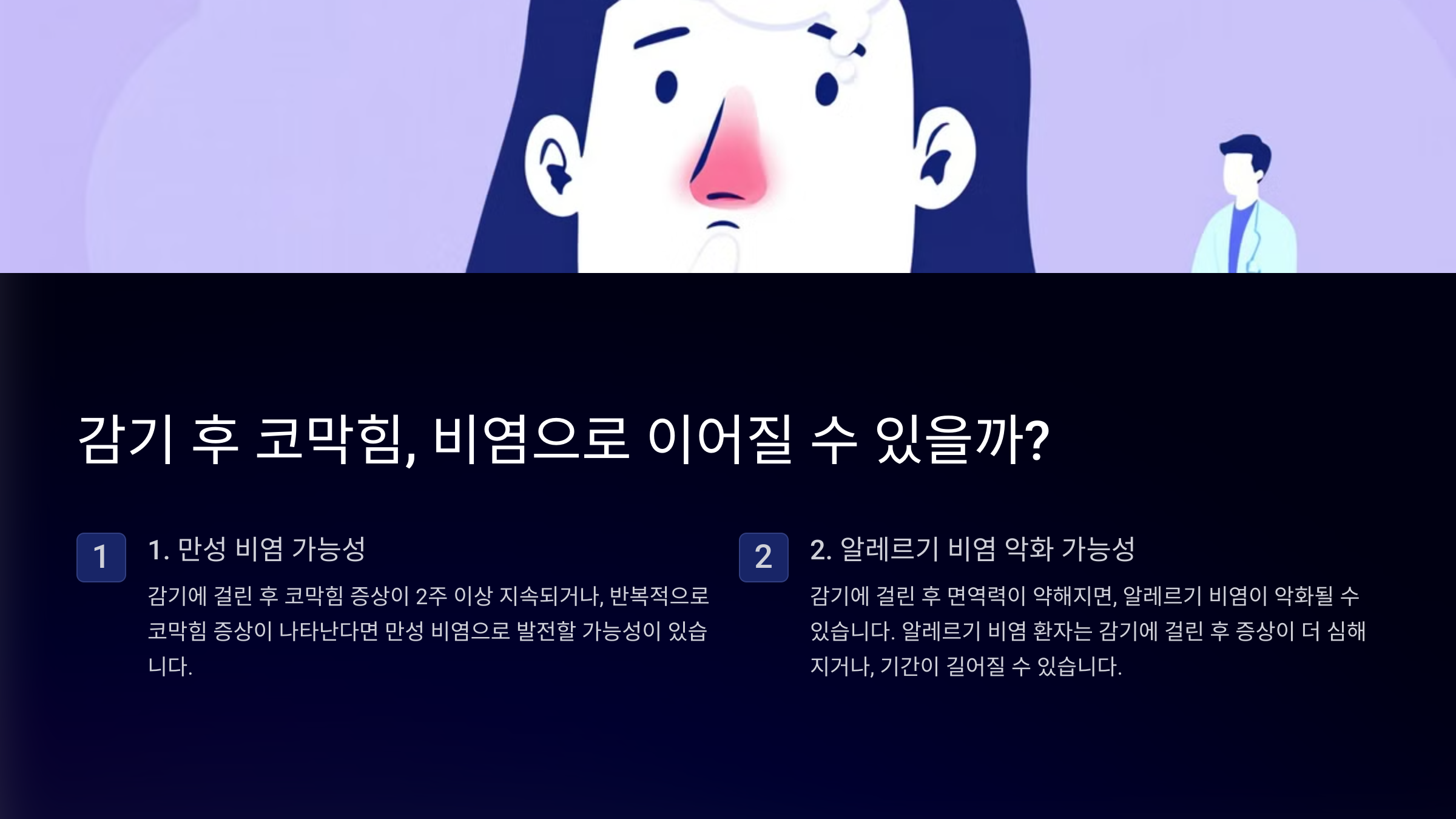감기 후에도 코막힘이 지속된다면 비염일 가능성이 높아요. 이럴 때는 병원에서 정확한 진단을 받고 환경을 개선하는 것이 중요해요! 😊