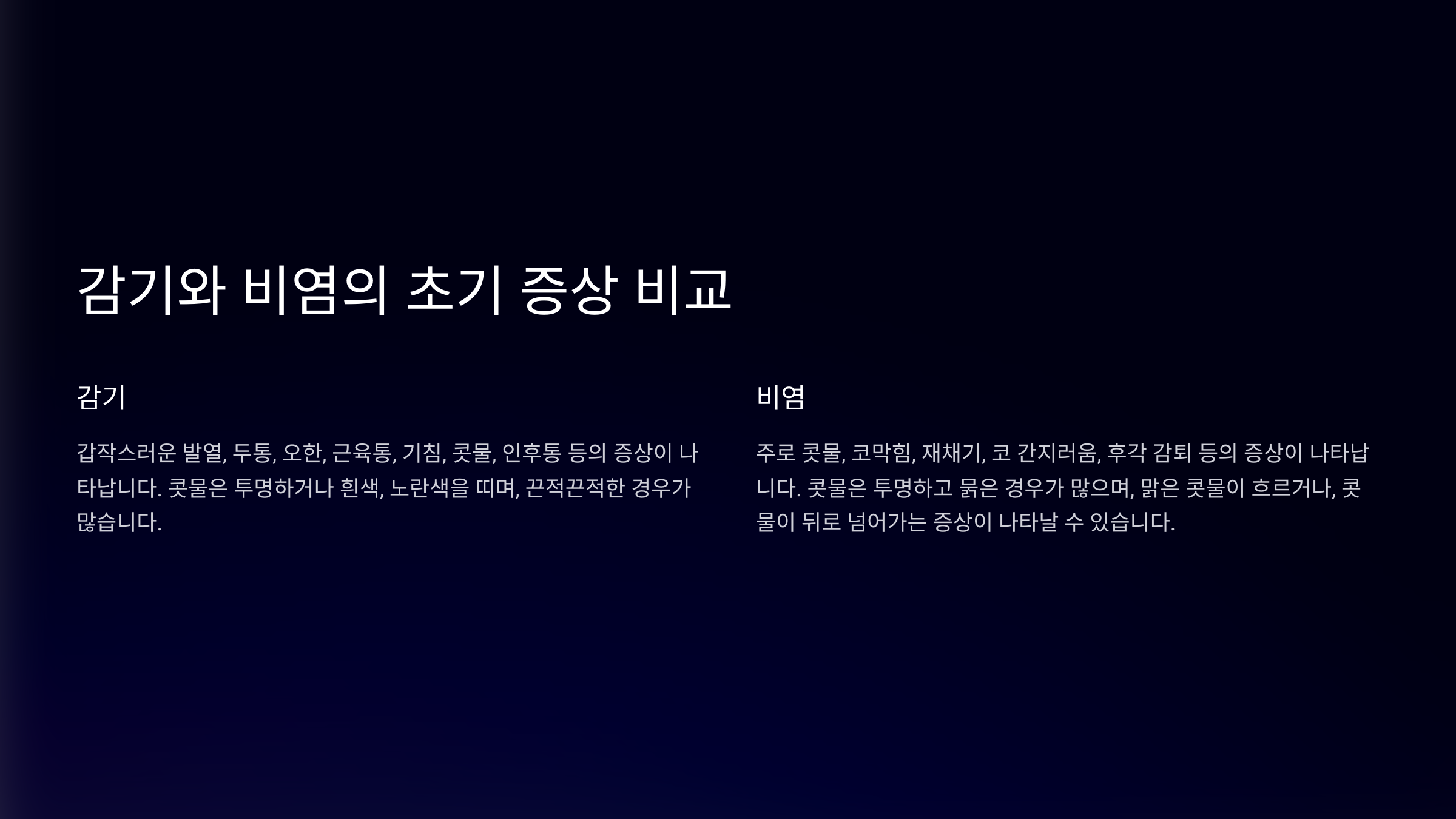 감기와 비염의 초기 증상을 구별하면 올바른 치료법을 선택할 수 있어요. 예를 들어, 감기라면 충분한 휴식과 수분 섭취가 필요하고, 비염이라면 알레르기 유발 요인을 피하는 것이 중요하답니다! 😊